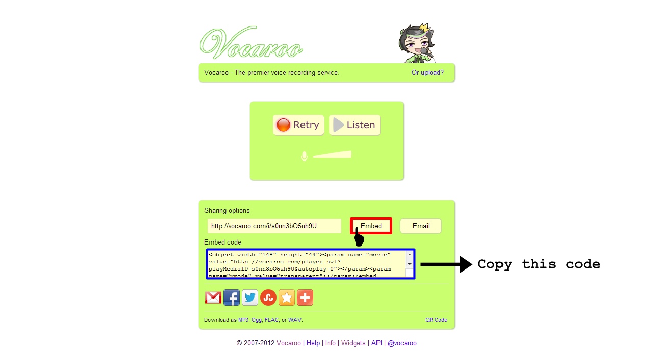 1. Download: You can save your recording by downloading it in various format. To download, click the desired format. Available formats are mp3, ogg, flac, wav.
